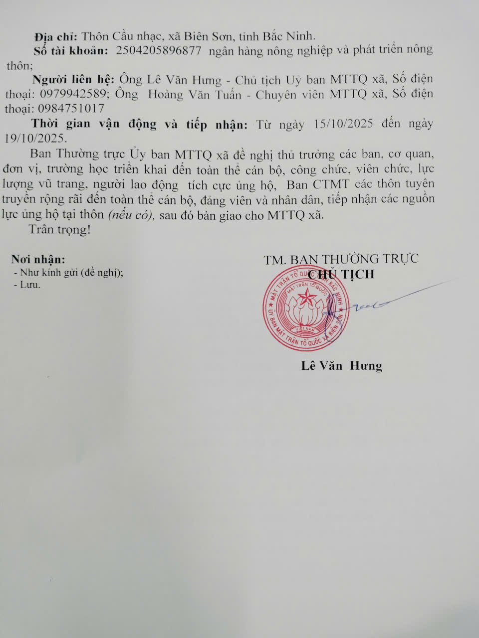 BIÊN SƠN - Ban Thường trực Ủy ban MTTQ xã Biên Sơn, tỉnh Bắc Ninh ban hành Công văn số 06/MTTQ-BTT ngày 14/10/2025 về việc quyên góp ủng hộ đồng bào bị ảnh hưởng bởi cơn bão số 11 gửi: Thường trực Đảng ủy, Thường trực HĐND, lãnh đạo UBND xã; Thủ trưởng các ban, cơ quan, đơn vị thuộc Đảng ủy, HĐND; Lãnh đạo Công an, Ban Chỉ huy Quân sự xã; Ban Giám hiệu các trường học trên địa bàn xã; Các tổ chức, doanh nghiệp, tập thể, cá nhân trong và ngoài xã.
